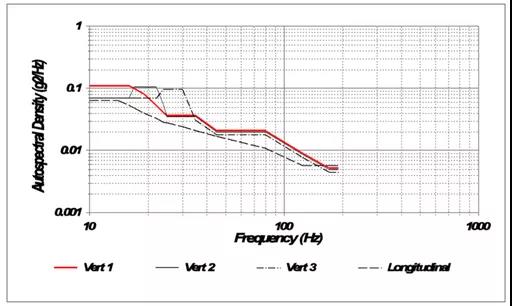 SAE J2380標(biāo)準(zhǔn)振動(dòng)目標(biāo)譜基于實(shí)際道路測量數(shù)據(jù),旨在模擬行駛10萬英里對(duì)電池組和模塊的影響。該標(biāo)準(zhǔn)要求一系列隨機(jī)振動(dòng)目標(biāo)譜應(yīng)用于三個(gè)垂直軸,試驗(yàn)時(shí)長從9分鐘到38小時(shí)不等。