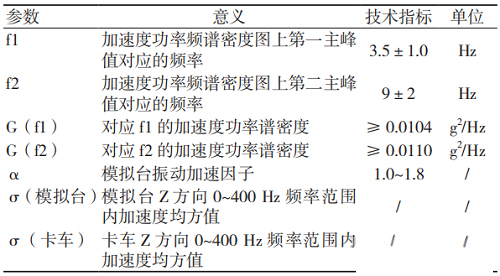 模擬運(yùn)輸臺(tái)的設(shè)計(jì)參數(shù)主要依據(jù)《QJ/T 815.2-94產(chǎn)品公路運(yùn)輸加速模擬試驗(yàn)方法》[3]設(shè)定。該標(biāo)準(zhǔn)中規(guī)定了模擬運(yùn)輸臺(tái)的關(guān)鍵技術(shù)指標(biāo),見表1。